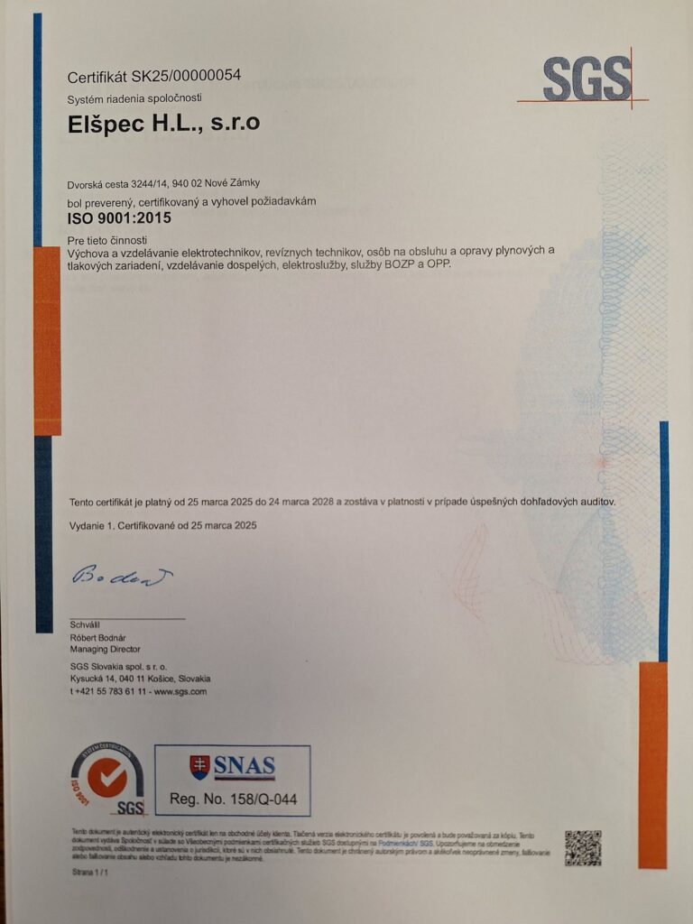 Od roku 2005 je firma Elšpec H.L., s.r.o. oprávnená vzdelávacia organizácia v oblasti ochrany práce s platnými oprávneniami v zmysle zák. č. 124/2006 Z. z. a zák. č. 125/2006 Z. z .